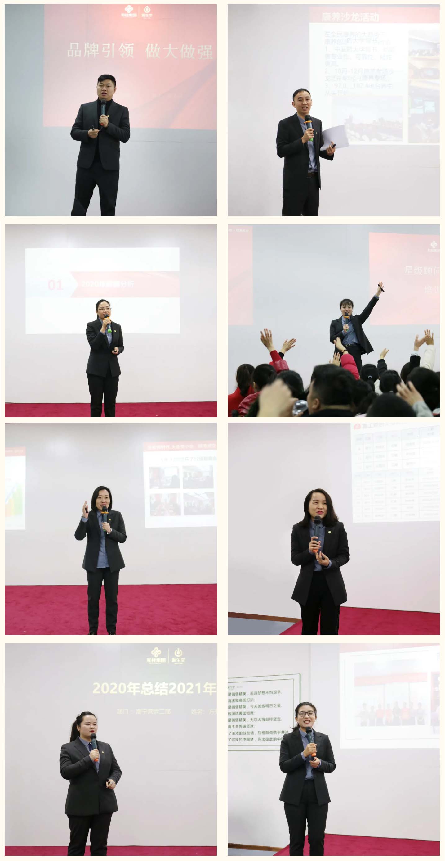各部門根據(jù)本部門的實際工作情況,分別從品牌規(guī)劃、產(chǎn)品研發(fā)、服務提升、門店管理、人員培訓、拓客營銷、招商加盟等方面進行了匯報,匯報工作亮點突出,可行性強,一個個奮斗的故事,感動人心,一個個創(chuàng)新的思路,振奮人心。參會的家人紛紛表示,2021年,一定會繼續(xù)發(fā)揚艱苦奮斗的精神,嚴格執(zhí)行各項工作計劃,超額完成制定的任務目標。